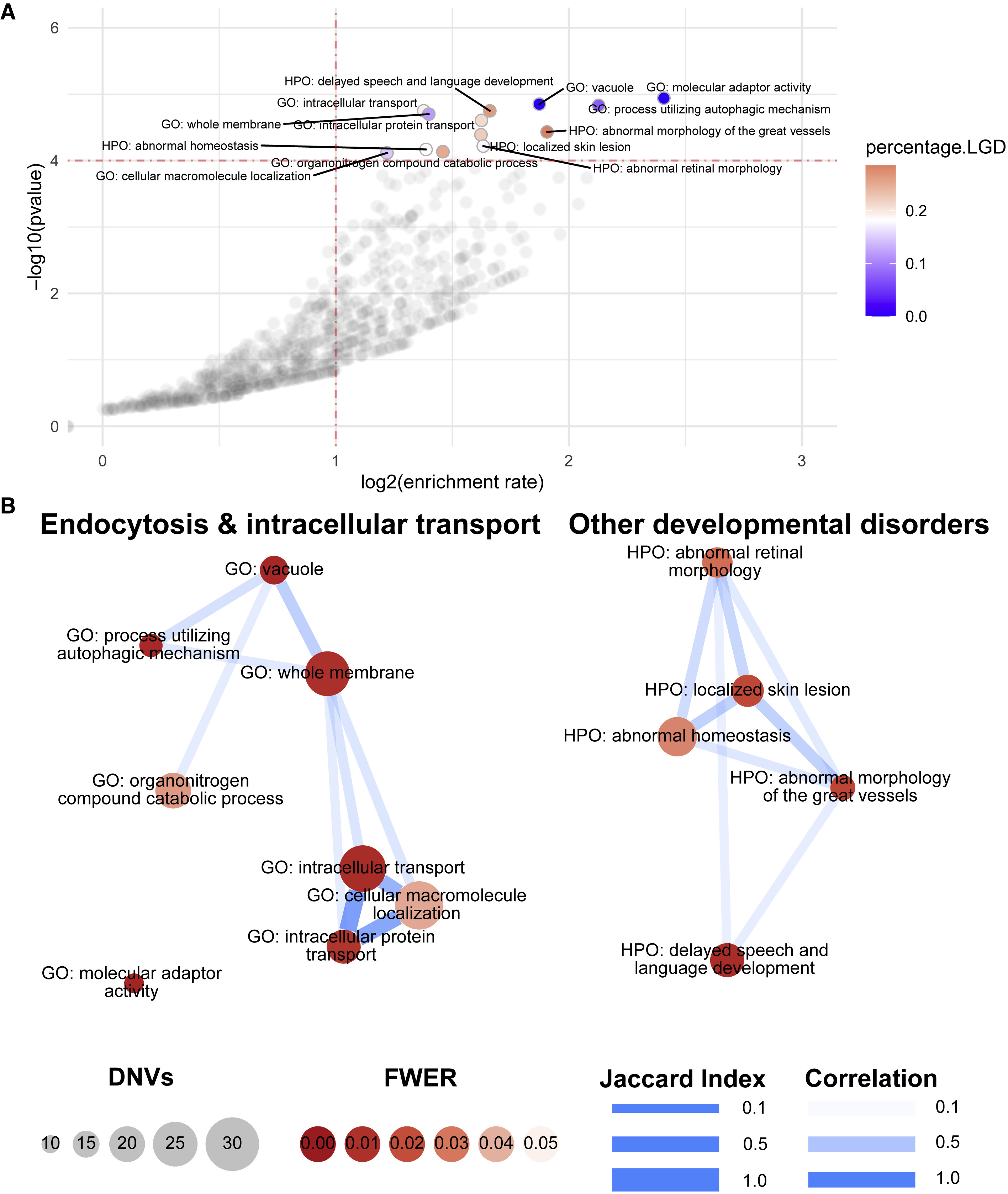 (A) Volcano plot. Each dot represents a pathway. X axis represents the enrichment rate in log scale, and Y axis is the Poisson test p value in log10 scale. The horizontal dashed line marks family-wise error rate (FWER) of 0.05. Significant pathways (FWER < 0.05) are colored by the percentage of LGD variants, and other pathways are colored gray.