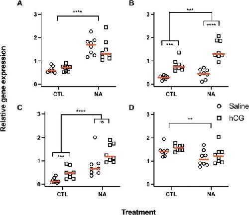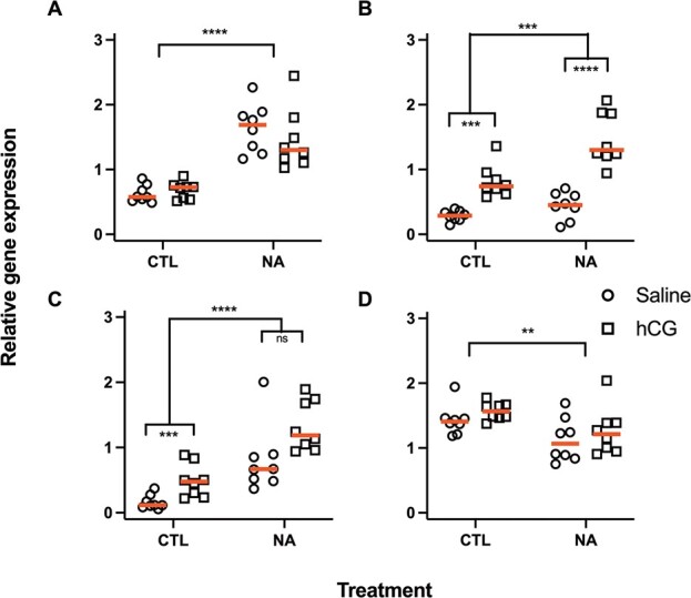 Figure 7. Relative gene expression of (A) lhr, (B) star, (C) cyp17a1 and (D) srd5a. Raw untransformed data are presented with red lines at medians. Statistical significance is indicated by asterisks. **P < 0.01, ***P < 0.001, ****P < 0.0001, ns; not statistically significant