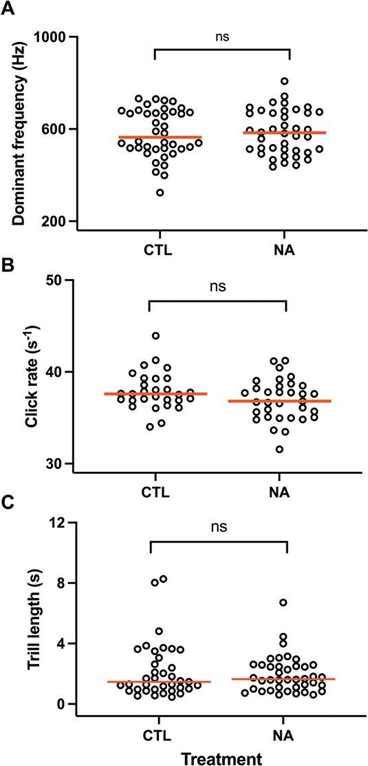 Figure 1. Effect of NA exposure on acoustic properties of vocalizations: (A) dominant frequency, (B) average click rate or (C) average trill length. Individual data presented and pooled across all experiments with red lines at medians. No significant (ns) effects were found (P > 0.05).