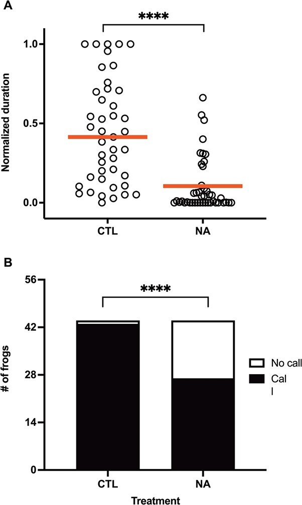 Figure 3. Effect of NA exposure on total calling duration, pooled across all experiments. (A) Individual data normalized proportionately from 0 to 1 and with red lines at medians and (B) count data of calling and non-calling frogs. Statistical significance is indicated by asterisks. ****P < 0.0001.