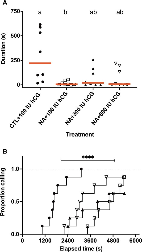 Figure 4. Effect of NA exposure and hCG rescue on calling duration and latency to call. (A) Individual total calling duration data are presented with red lines at medians. Different letters represent statistically significant difference (P < 0.05). (B) Individual latency data are presented as survival curves. Statistically significant difference is indicated by asterisks. ****P < 0.0001.