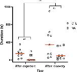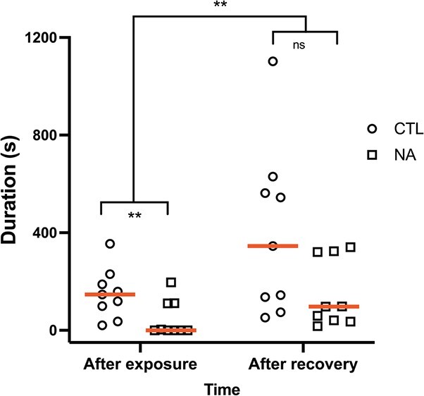 Figure 5. Effect of NA exposure and two weeks of recovery in clean water on individual calling duration. Analyses performed on log(x + 1) transformed data. Raw untransformed data are presented with red lines at medians. Statistical significance is indicated by asterisks. **P < 0.01, ns; not statistically significant.
