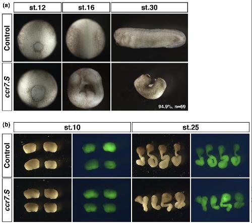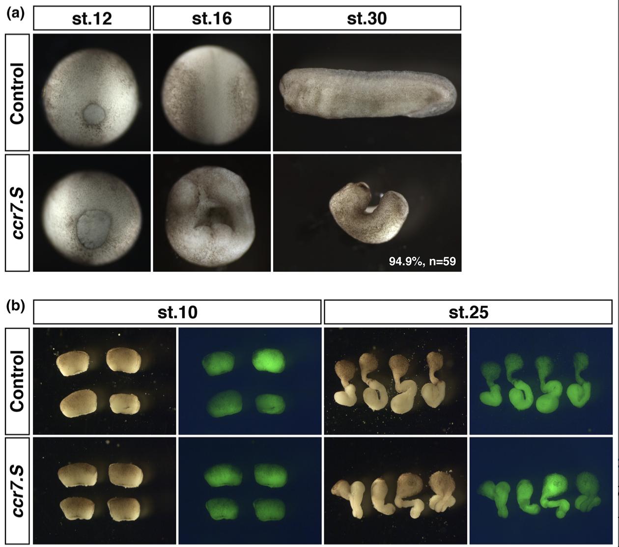 Figure 2. Phenotypes of embryos dorsally injected with ccr7.S mRNA and Keller sandwich explants. (a) Embryos dorsally injected with ccr7.S mRNA. The developmental stages are indicated in the upper panels. Vegetal views (st.12), dorsal views (st.16), and lateral views (st.30) are shown. The appearance rate (%) of indicated phenotype and the number of the examined embryos (n) are indicated. (b) Keller sandwich explants of embryos that were dorsally injected with ccr7.S mRNA. The upper panels indicate the stages of the time- control embryos. The right images represent fluorescent images of the explants