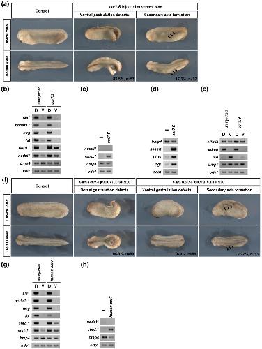 (n = 57). Ventral gastrulation defects, 89.6% (n = 58). Dorsal gastrulation defects, 85.7% (n = 49). Ventral gastrulation defects, 86.7% (n = 53). (c) RT-PCR analysis of the dorsal or ventral sectors of embryos injected with MO and the indicated mRNA(s) at the gastrula stage.