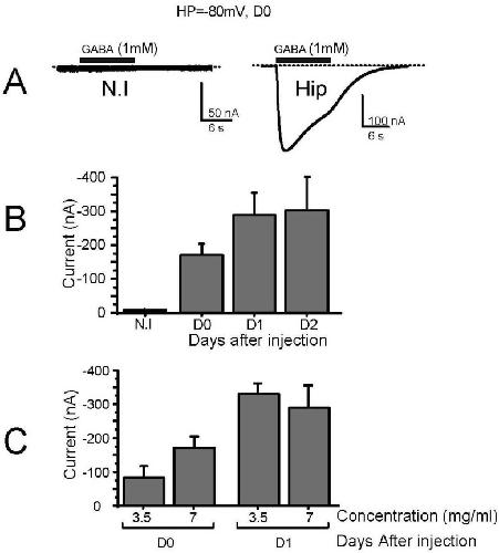Figure 1. Kinetic of receptor expression after injection of membrane preparation. (A) Typical current traces recorded in response to perfusion of GABA (1 mM) of control oocytes (N.I.) or oocytes injected with hippocampal brain membrane preparation (Hip), 6 h after injection (D0). (B) Kinetics of the response to GABA of oocytes injected with hippocampal brain membrane preparation quantified as the peak current amplitude recorded in response to GABA application (1 mM, HP = −80 mV, EC50 = 81µM) at D0: 6 h after membrane injection, and D1 and D2: 24 and 48 h after membrane injection, respectively. (C) Effect of injected hippocampal membrane concentration on the amplitude of the response of the oocytes to the perfusion of GABA. Two concentrations were used (3.5 and 7 mg/mL) and two time points were analyzed (D0 and D1).