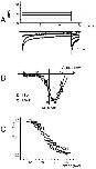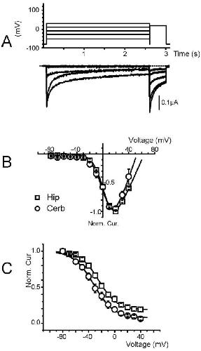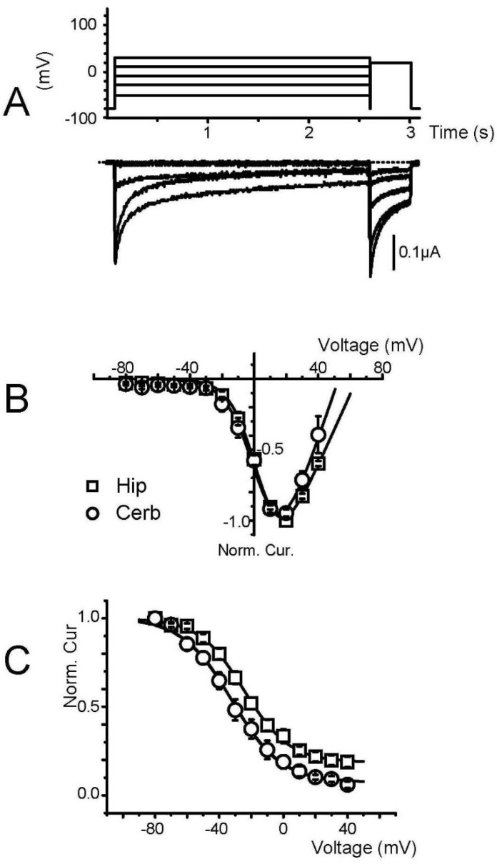 Figure 3. Biophysical properties of expressed voltage-gated Ca2+ channels. (A) Typical current traces recorded from an oocyte one day after injection of a hippocampal membrane preparation (7 mg/mL) during a twostep protocol. The first conditioning step had a duration of 2.5 s, and an amplitude varying from −80 to +40 mV in 10 mV increments, while the second step had a duration of 400 ms and remained at the same value ( +10 mV). Only some steps are displayed here. (B) Current–voltage curves obtained from similar protocols by plotting the relative peak current amplitude recorded during the first step as a function of the voltage of this step. These curves were obtained on oocytes injected with either hippocampal (Hip) or cerebellum (Cerb) membrane preparations, and Vact, kact, and Erev were 4.7 ± 0.4 mV; 7.7 ± 0.3 mV, 67 ± 1 mV (n = 8), and 6.8 ± 1.3 mV; and 8.4 ± 0.5 mV and 54 ± 2 mV (n = 11) for hippocampal and cerebellar membranes, respectively. (C) Isochronal inactivation curves obtained by plotting the relative peak current amplitude recorded during the second step as a function of the voltage of the first step. These curves were obtained on oocytes injected either with hippocampal (Hip) or cerebellum (Cerb) membrane preparations, and Vin, kin, and Rin were −25 ± 3 mV; 13 ± 1 mV, 0.1 ± 0.02 (n = 5), and −31 ± 4 mV; 15 ± 1 mV and 0.2 ± 0.01 (n = 10) for hippocampal and cerebellar membranes, respectively.