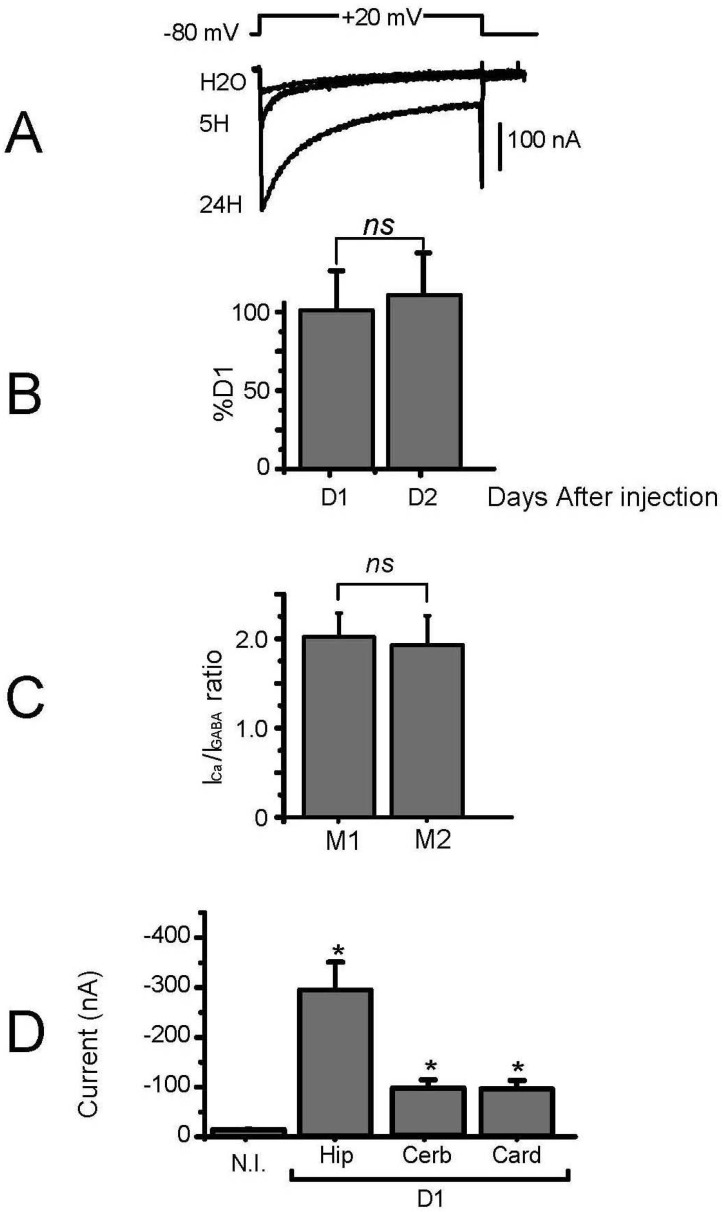Figure 2. Expression of voltage-gated Ca2+ channels after injection of membrane preparation. (A) Typical current traces recorded on oocytes injected with water (H2O), or hippocampal membrane preparation in response to depolarizations to +20 mV from a holding potential of −80 mV, 5 h (5 H) or 24 h (24 H) after injection. The recording medium contained 40 mM Ba2+. (B) Expression was at its maximum level one day after injection (D1, set at 100%), and the current amplitude was similar at day 2 (D2) following membrane injection. (C) Histogram showing the ratio of the level of Ca2+ channel expression (measured as the peak current amplitude recorded during a depolarizing pulse to +10 mV in BANT40) on GABA receptor expression (measured as the peak current amplitude in response to 1 mM GABA at HP of −80 mV in ND86) for two different mice, M1 and M2. (D) Different membrane preparations (at 5 mg/mL) produced different levels of voltage-gated Ca2+ channel expression (N.I: non-injected oocytes, or oocytes injected with Hip: hippocampal membrane, Cerb: cerebellum membrane or Card: cardiac ventricular membrane). ns means—not significant, *—with injection.