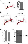 Figure 4. Pharmacology of the transplanted voltage-gated Ca2+ channels. (A) Typical response of a hippocampal membrane-injected oocyte to 10 µM nifedipine. Voltage-gated Ca2+ currents were recorded during 400 ms-long depolarizations from −80 mV to +20 mV in the presence of 40 mM Ba2+. Right: histogram showing the average response to nifedipine. (B) Response of transplanted voltage-gated Ca2+ channels to the µ-opioid agonist DAMGO (10 µM). Oocytes were injected with hippocampal membrane preparation, and were re-injected 24 h later with either H2O (Hip) or the µ1 opiod receptor RNA at 1 ug/uL (Hip + µOR1). Recordings were made 48 h after the hippocampal membrane injection. (C) Average response to 10 µM DAMGO of transplanted voltage-gated Ca2+ channels co-injected or not with the µ1 opioid receptor RNA (D). Western blot using either hippocampal (Hip) or cerebellum (Cer) membrane preparations and probed with an anti-CaVβcom antibody showed that, in both cases, the cytoplasmic voltage-gated Ca channel auxiliary subunits, CaVβ, remained associated with the channel subunit(s). *—with injection.