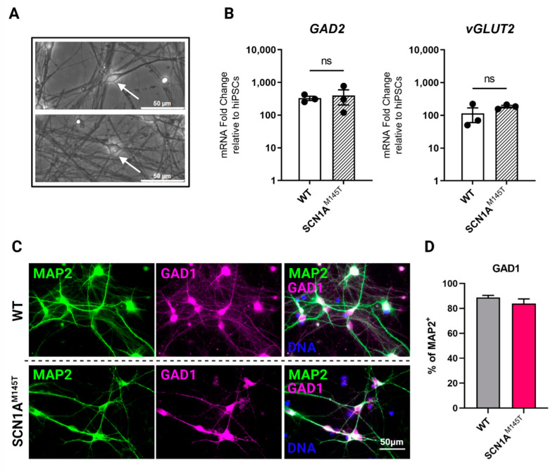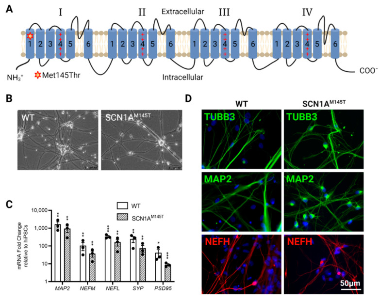 Mutations in SCN1A gene, encoding the voltage-gated sodium channel (VGSC) NaV1.1, are widely recognized as a leading cause of genetic febrile seizures (FS), due to the decrease in the Na+ current density, mainly affecting the inhibitory neuronal transmission. Here, we generated induced pluripotent stem cells (iPSCs)-derived neurons (idNs) from a patient belonging to a genetically well-characterized Italian family, carrying the c.434T > C mutation in SCN1A gene (hereafter SCN1AM145T). A side-by-side comparison of diseased and healthy idNs revealed an overall maturation delay of SCN1AM145T cells. Membranes isolated from both diseased and control idNs were injected into Xenopus oocytes and both GABA and AMPA currents were successfully recorded. Patch-clamp measurements on idNs revealed depolarized action potential for SCN1AM145T, suggesting a reduced excitability. Expression analyses of VGSCs and chloride co-transporters NKCC1 and KCC2 showed a cellular “dysmaturity” of mutated idNs, strengthened by the high expression of SCN3A, a more fetal-like VGSC isoform, and a high NKCC1/KCC2 ratio, in mutated cells. Overall, we provide strong evidence for an intrinsic cellular immaturity, underscoring the role of mutant NaV1.1 in the development of FS. Furthermore, our data are strengthening previous findings obtained using transfected cells and recordings on human slices, demonstrating that diseased idNs represent a powerful tool for personalized therapy and ex vivo drug screening for human epileptic disorders.