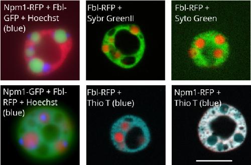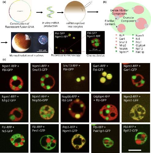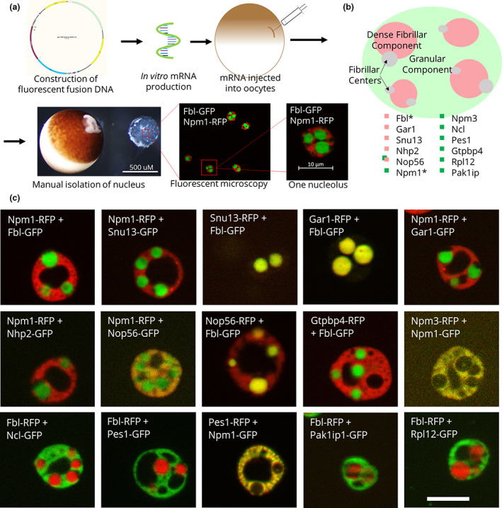 FIGURE 1. Fluorescent fusion protein nucleolar localization. (a) Schematic of fluorescent fusion protein expression within Xenopus laevis oocyte nucleoli, showing the expression of the canonical domain markers Npm1 (fused with RFP) and Fbl (fused with GFP). (b) Model of the localization of each of these proteins. *Canonical domain markers. (c) Images of representative nucleoli with the labeled fluorescent fusion expressed with either Npm1 or Fbl, the canonical domain markers for the granular component and the dense fibrillar component, respectively. Scale bar = 10 μm |
