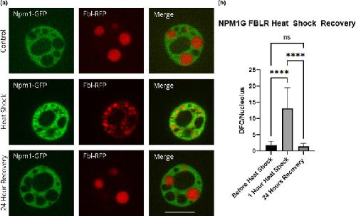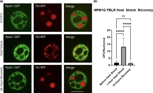 FIGURE 3. Recovery of fibrillarin after heat shock. Oocytes were heat shocked at 37°C for 1 h (controls were left at 13°C) in OCM and then recovered at 13°C for 24 h in OCM. (a) Representative images of nucleoli expressing fluorescently labeled Npm1 and Fbl after heat shock treatment and recovery. All images are of unfixed samples. (b) Graphical representation of a heat shock and recovery treatment showing the number of punctate spots in the control vs. heat shock vs. recovery as represented by the dense fibrillar component protein fibrillarin (p < .05). Scale bar = 10 μm |