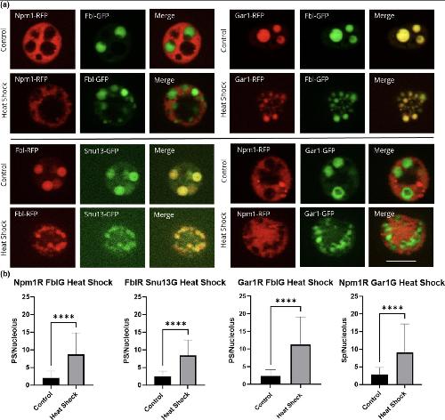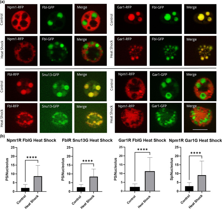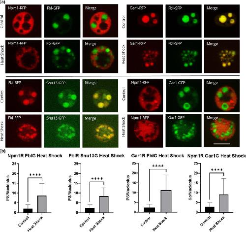 FIGURE 4. Nucleolar proteins after heat shock. Oocytes were heat shocked at 37°C for 1 h (controls were left at 13°C) in OCM for 1 h. (a) Representative images of nucleoli expressing fluorescently labeled proteins after heat shock treatment. RFP‐fused proteins are shown in the first column of, GFP‐fused proteins are shown in the second column, the merged images are shown in the third column. All images are of unfixed samples. Scale bar = 10 μm. (b) Graphical representation of a dataset of heat shock treatments showing the number of punctate spots per nucleolus from oocytes treated at 13°C (control) or 37°C (heat shock) for 1 h as represented by the dense fibrillar component localization protein indicated in either red or green. PS = punctate spots, which are partial dense fibrillar components. Each experiment was repeated three times, all producing significant changes between untreated and heat shocked nucleoli (p < .05). Scale bar = 10 μm |