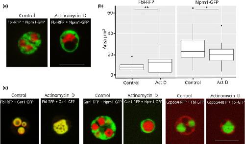 Figure 5. (a) Fluorescence microscopy images of actinomycin D treatment of nucleoli from oocytes injected with Fbl-RFP and Npm1-GFP. (b) Quantification of the area occupied by Fbl and Npm1 before and after actinomycin D treatment. (c) Representative images of actinomycin D-treated Fbl-RFP/Gar1-GFP, Gar1-mCherry/Npm1-GFP, and Gtpbp4-mCherry/Fbl-GFP. Scale bar = 10 μm |