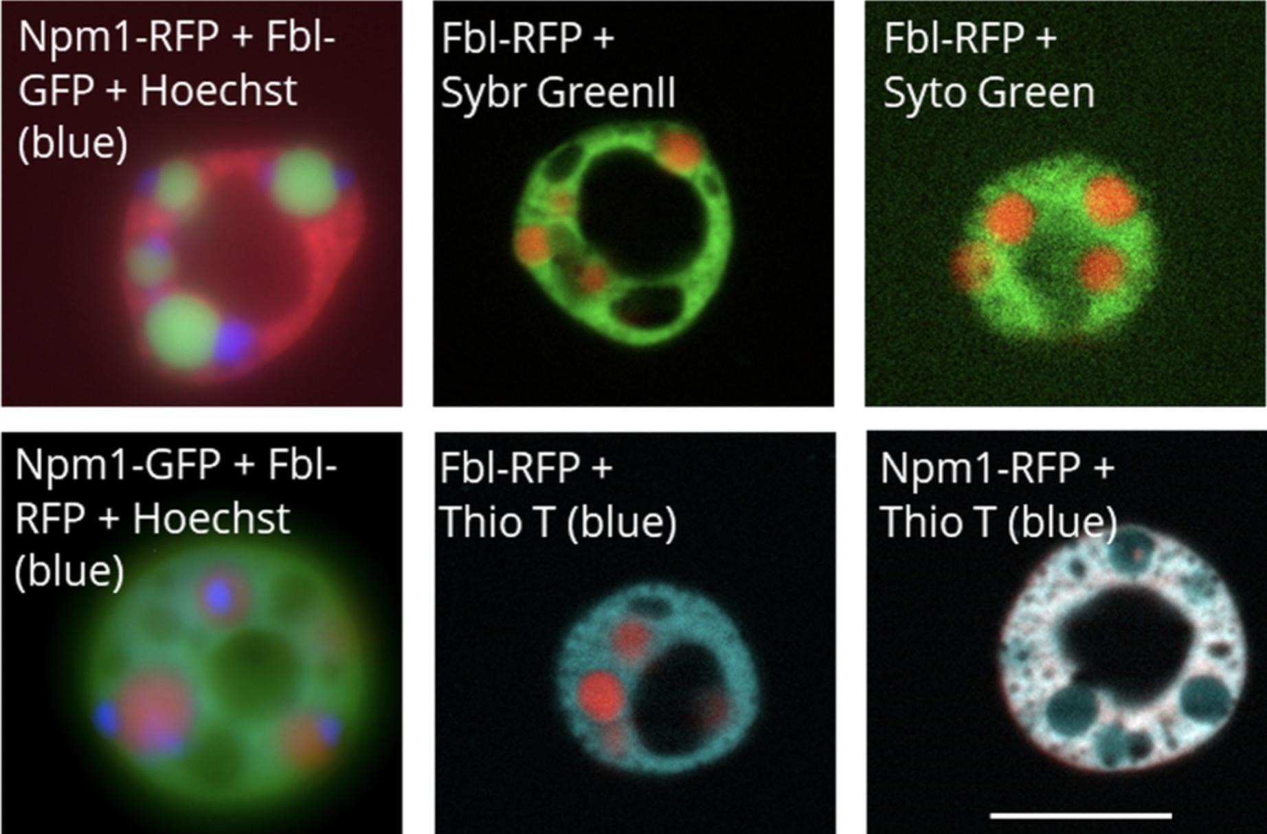 Figure 2. Representative images of Hoechst 33342, Sybr Green II, Syto Green, and Thioflavin T nucleolar staining as indicated by the label on each image. The Hoechst images are whole field fluorescence images, while all other images are apotome section fluorescence images. Scale bar = 10 μm |