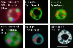 Figure 4. Nucleolar proteins after heat shock. Oocytes were heat shocked at 37°C for 1 h (controls were left at 13°C) in OCM for 1 h. (a) Representative images of nucleoli expressing fluorescently labeled proteins after heat shock treatment. RFP-fused proteins are shown in the first column of, GFP-fused proteins are shown in the second column, the merged images are shown in the third column. All images are of unfixed samples. Scale bar = 10 μm. (b) Graphical representation of a dataset of heat shock treatments showing the number of punctate spots per nucleolus from oocytes treated at 13°C (control) or 37°C (heat shock) for 1 h as represented by the dense fibrillar component localization protein indicated in either red or green. PS = punctate spots, which are partial dense fibrillar components. Each experiment was repeated three times, all producing significant changes between untreated and heat shocked nucleoli (pâ<â.05). Scale bar = 10 μm |