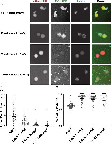 Figure 1. F-actin induces bilobed nuclei in Xenopus egg extracts. (A) F-actin-intact extracts were supplemented with either DMSO or different concentrations of cytochalasin B (Cyto B). After 90â min of nuclear assembly, nuclei were visualized by the import of mCherryâNLS, F-actin was visualized with LifeActâGFP and DNA was visualized with Hoechst 33342. (B) Total nuclear F-actin intensity was measured based on LifeActâGFP signal intensity (Pelletier et al., 2020), normalized to DMSO controls. Based on two independent experiments, the nucleus numbers quantified were: DMSO, n=141; Cyto B (1â ng/µl), n=133; Cyto B (10â ng/µl), n=141; Cyto B (100â ng/µl), n=108. (C) Nuclear circularity was quantified. Based on two independent experiments, the nucleus numbers quantified were: DMSO, n=141; Cyto B (1â ng/µl), n=137; Cyto B (10â ng/µl), n=141; Cyto B (100â ng/µl), n=108. Images were obtained by widefield microscopy and are representative of two experiments. Mean values and 95% c.i. error bars are shown. Nonparametric KruskalâWallis tests were performed, showing statistical significance relative to DMSO controls. a.u., arbitrary units. ****Pâ¤0.0001. |