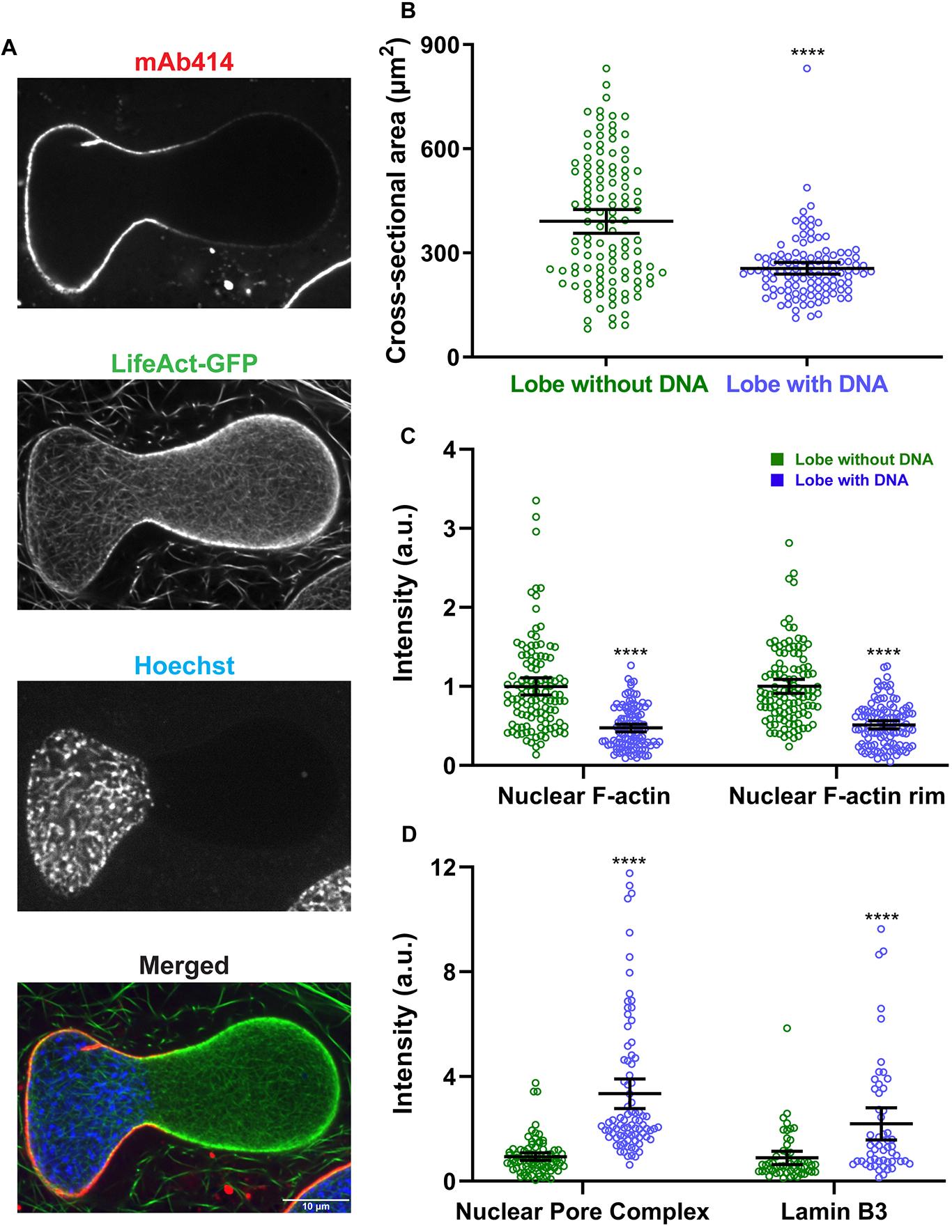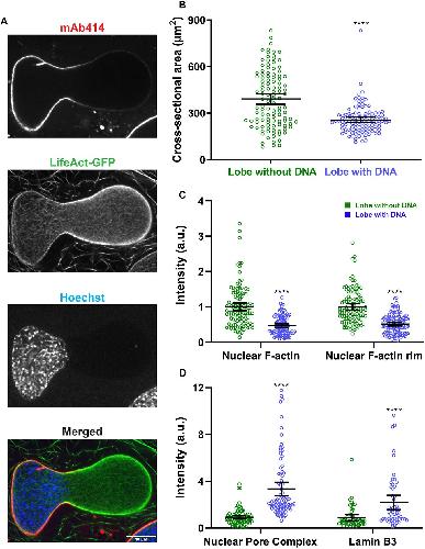 Figure 2. The nuclear envelope is structurally heterogeneous in bilobed nuclei. (A) After 90â min of nuclear assembly in F-actin-intact extracts, nuclei were stained with mAb414 (to label NPCs), LifeActâGFP (F-actin) and Hoechst 33342 (DNA) and imaged by confocal microscopy. In some cases, F-actin was labeled with Alexa Fluor 488 phalloidin. A bilobed nucleus is shown (representative of four experiments). (B) Nuclear cross-sectional area was quantified based on F-actin staining for the lobes with and without Hoechst 33342-stained DNA (n=113 nuclei, five independent experiments) using widefield microscopy. (C) Total nuclear F-actin and F-actin localized to the nuclear rim were quantified (n=113 nuclei, five independent experiments) using widefield microscopy, in each case normalized to the lobe without Hoechst 33342-stained DNA. (D) NPC intensity in the two lobes was quantified based on mAb414 staining (n=85 nuclei, four independent experiments) using widefield microscopy. To quantify Lamin B3 intensity in the two lobes, extracts were supplemented with GFPâLamin B3 and imaging performed by confocal microscopy (n=54 nuclei). In both cases, intensity values were normalized to the lobe without Hoechst 33342-stained DNA. Mean values and 95% c.i. error bars are shown. Nonparametric MannâWhitney tests were performed, showing statistical significance relative to the lobe without Hoechst 33342-stained DNA. a.u., arbitrary units. ****Pâ¤0.0001. |
