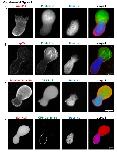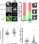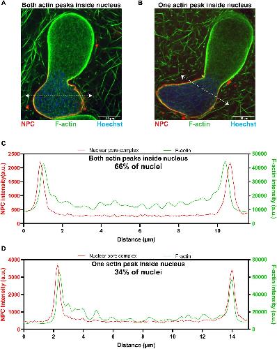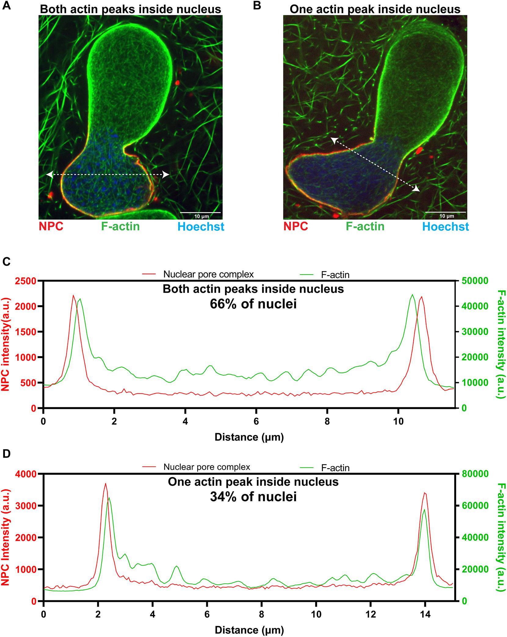 Figure 3. Intranuclear F-actin is enriched at the nuclear rim in bilobed nuclei. (A,B) Bilobed nuclei formed in F-actin-intact Xenopus egg extracts were imaged with mAb414 (NPCs, red), LifeActâGFP (F-actin, green) and Hoechst 33342 (DNA, blue) using confocal microscopy. Intensity line scans (dotted white lines) were used to determine where F-actin localizes relative to the NE, determined by NPC staining. Representative nuclei in which both F-actin peaks are intranuclear with respect to the NPC peaks (A) and in which one actin peak is intranuclear with respect to the NPC peak and the other actin peak colocalizes with the NPC peak (B) are shown. (C) Intensity measurements for the line scan shown in A. (D) Intensity measurements for the line scan shown in B. In total, 65 nuclei were analyzed as shown in C and D from two independent experiments. a.u., arbitrary units. |