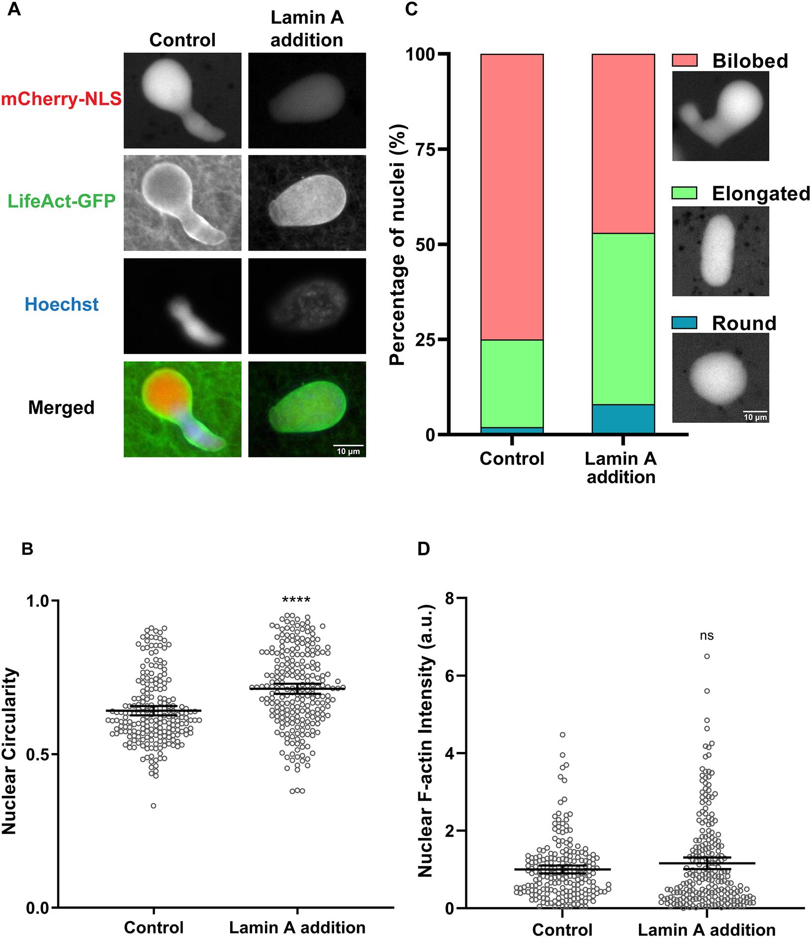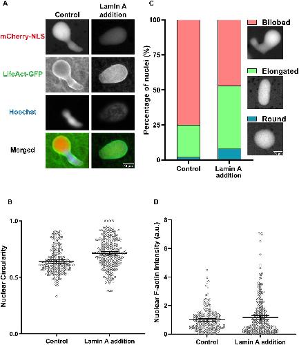 Figure 4. Addition of Lamin A to F-actin-intact extracts partially rescues the bilobed nuclear phenotype. (A) F-actin-intact extracts were supplemented with 280â nM recombinant Lamin A and nuclei were imaged after 90â min of nuclear assembly. Widefield images (representative of four experiments) are shown for a control nucleus (circularity 0.57) and a nucleus from Lamin A-supplemented extracts (circularity 0.85). (B) Nuclear circularity was quantified from four independent experiments for 212 control nuclei and 234 nuclei from Lamin-A supplemented extracts. (C) For the data presented in B, nuclei were characterized as bilobed (circularity <0.7), elongated (circularity 0.7-0.9) or round (circularity >0.9), and representative nuclei importing mCherryâNLS are shown. (D) Total nuclear F-actin was measured based on LifeActâGFP staining and normalized to the control for 212 control nuclei and 237 nuclei from Lamin A-supplemented extracts from four independent experiments. Mean values and 95% c.i. error bars are shown. Nonparametric MannâWhitney tests were performed, showing statistical significance relative to controls. a.u., arbitrary units. ns, not significant; ****Pâ¤0.0001. |