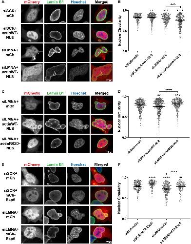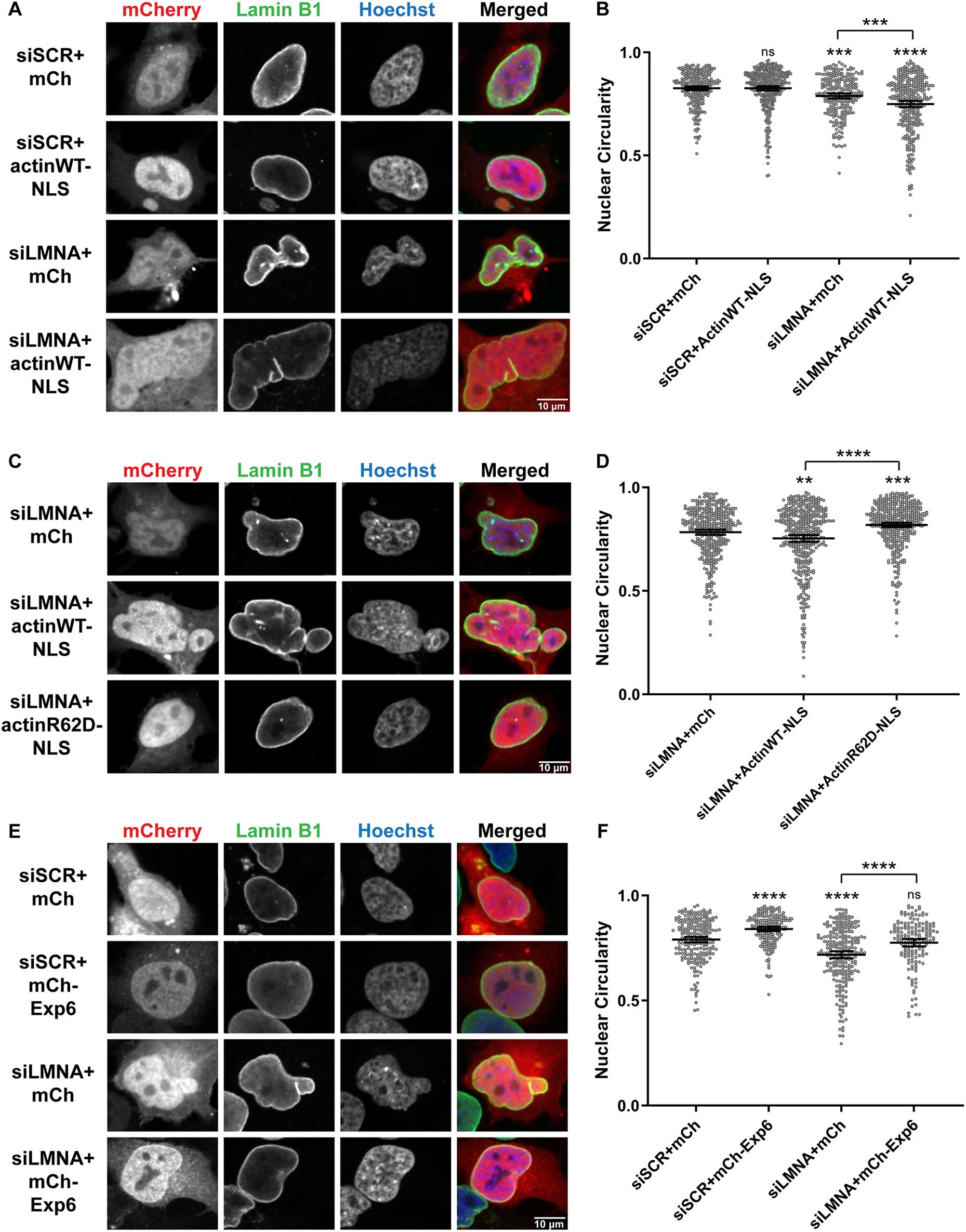 Figure 5. Dynamic nuclear F-actin alters nuclear shape in HeLa cells. HeLa cells were transfected with the indicated plasmids: mCh (pEmCherry-C2), actinWTâNLS (actin-3ÃNLS P2A mCherry), actinR62DâNLS (pmCherry-C1 R62D actin-3ÃNLS P2A) and mChâExp6 (pcDNA3.1-mCherry-Exp6). For knockdowns, cells were transfected with a scrambled control (siSCR) or siRNA targeted against Lamin A/C (siLMNA). Fixed cells were stained for Lamin B1 (green) and DNA (Hoechst 33342, blue). Only transfected cells expressing mCherry were quantified. (A) Representative images are shown. (B) Nuclear circularity measurements for A. Based on three independent experiments, the nucleus numbers quantified were: siSCR+mCh (n=283), siSCR+actinWTâNLS (n=357), siLMNA+mCh (n=244) and siLMNA+actinWTâNLS (n=332). (C) Representative images are shown. (D) Nuclear circularity measurements for C. Based on four independent experiments, the nucleus numbers quantified were: siLMNA+mCh (n=382), siLMNA+actinWTâNLS (n=412) and siLMNA+actinR62DâNLS (n=443). (E) Representative images are shown. (F) Nuclear circularity measurements for E. Based on two independent experiments, the nucleus numbers quantified were: siSCR+mCh (n=223), siSCR+mChâExp6 (n=195), siLMNA+mCh (n=255) and siLMNA+mChâExp6 (n=165). Images were obtained by confocal microscopy. Mean values and 95% c.i. error bars are shown. One-way ANOVA with multiple comparisons and post-hoc Tukey tests were performed, showing statistical significance relative to controls. ns, not significant; **Pâ¤0.01; ***Pâ¤0.001; ****Pâ¤0.0001. |