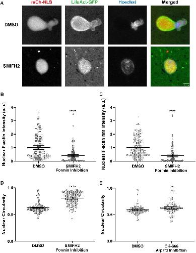 Figure 6. Formin inhibition rescues bilobed nuclear morphology in Xenopus egg extracts. (AâD) Experiments were performed as in Fig. 1 with F-actin-intact extracts except that DMSO or 500â µM SMIFH2 was added after 45â min of nuclear assembly. Based on three independent experiments, 144 DMSO-treated nuclei and 137 SMIFH2-treated nuclei were quantified. (A) Representative images from live imaging are shown. (B) Total nuclear F-actin intensity was quantified based on LifeActâGFP staining and normalized to the DMSO control. (C) F-actin intensity at the nuclear rim was quantified based on LifeActâGFP staining and normalized to the DMSO control. (D) Nuclear circularity was quantified. (E) Experiments were performed as in Fig. 1 with F-actin-intact extracts except that DMSO or 500â µM CK-666 was added after 45â min of nuclear assembly. Based on three independent experiments, nuclear circularity was quantified for 83 DMSO-treated nuclei and 79 CK-666-treated nuclei. Mean values and 95% c.i. error bars are shown. Nonparametric MannâWhitney tests were performed on the SMIFH2 data. two-tailed unpaired Student's t-tests were performed on the CK-666 data. Statistical significance is shown relative to DMSO controls. a.u., arbitrary units. ns, not significant; ****Pâ¤0.0001. |