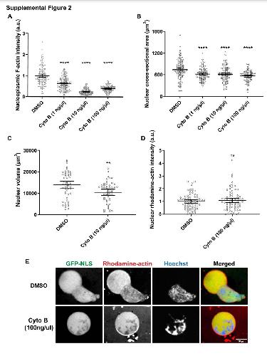 Fig. S2. Nuclear F-actin promotes increased nuclear size. (A) For the experiments described in Figure 1, nucleoplasmic F-actin intensity was measured based on LifeActGFP signal within the nucleoplasm (excluding rim signal), normalized to DMSO controls. Images were acquired by widefield microscopy. Based on 2 independent experiments, the number of nuclei quantified was 129 DMSO nuclei, 149 Cyto B (1 ng/µl) nuclei, 164 Cyto B (10 ng/µl) nuclei, and 123 Cyto B (100 ng/µl) nuclei. (B) For the experiments described in Figure 1, nuclear cross-sectional area was measured based on mCherryNLS signal from widefield microscopy images. Based on 2 independent experiments, the number of nuclei quantified was 141 DMSO nuclei, 133 Cyto B (1 ng/µl) nuclei, 141 Cyto B (10 ng/µl) nuclei, and 108 Cyto B (100 ng/µl) nuclei. (C) For the experiments described in Figure 1, confocal z-stack images were acquired based on mCherry-NLS signal and nuclear volume was quantified for 52 DMSO control nuclei and 50 nuclei from the 10 ng/µl cytochalasin treatment condition. (D-E) Experiments were performed as in Figure 1 except that extract was supplemented with Rhodamine-actin to visualize total actin (red), GFP-NLS (green), and Hoechst (blue). (D) Mean nuclear Rhodamine-actin signal intensity was measured for 77 nuclei for each condition and normalized to the DMSO control. (E) Representative images are shown. Mean values and 95% confidence interval (CI) error bars are shown. Student’s t-tests were performed for (C) and (D). Nonparametric Kruskall-Wallis tests were performed for (A) and one-way ANOVA was performed for (B). Statistical significance is shown relative to DMSO controls. P>0.05 ns, P≤0.01 **, P≤0.0001 **** |