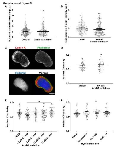 Fig. S3. Lamin A localization and inhibition of actin regulators in F-actin intact Xenopus egg extracts. (A) Experiments were performed as in Figure 4. F-actin at the nuclear rim was quantified based on LifeAct-GFP signal intensity from widefield microscopy images. Data are from 4 independent experiments with 320 nuclei for control and 322 nuclei for Lamin A addition. (B) Experiments were performed as in Figure 6. Nucleoplasmic F-actin intensity was measured based on LifeAct-GFP signal within the nucleoplasm (excluding rim signal) from widefield microscopy images. Based on 3 independent experiments, 160 DMSO nuclei and 145 SMIFH2 nuclei were quantified. (C) Experiments were performed as in Figure 4. For extracts supplemented with recombinant Lamin A, nuclei were fixed, spun down onto coverslips, and stained for His-tagged Lamin A (red), Phalloidin (green), and Hoechst (blue). Representative confocal microscopy images are shown. (D) Experiments were performed as in Figure 1 with F-actin intact extract except that 200 µM of Arp2/3 inhibitor CK-636 was added after 45 minutes of nuclear assembly. Nuclear circularity was measured for 47 DMSO nuclei and 44 CK-636 nuclei. (E) Experiments were performed as in Figure 1 with F-actin intact extract except that the indicated concentrations of Arp2/3 inhibitor CK-869 were added after 45 minutes of nuclear assembly. Nuclear circularity was measured for 62 DMSO nuclei, 49 CK-869 (0.1 µM) nuclei, 47 CK-869 (1 µM) nuclei, 61 CK-869 (10 µM) nuclei, and 33 CK-869 (50 µM) nuclei. (F) Experiments were performed as in Figure 1 with F-actin intact extract except that 100 µM of the indicated myosin inhibitors was added after 45 minutes of nuclear assembly. Nuclear circularity was measured for 69 DMSO nuclei, 41 Blebbistatin nuclei, 38 ML-7 HCl nuclei, and 44 MLCK-18 nuclei. Mean values and 95% CI error bars are shown. Nonparametric Mann-Whitney tests were performed in (A), (B), and (D). Nonparametric Kruskall-Wallis tests were performed in (E) a nd (F). Statistical significance is shown relative to DMSO controls. P>0.05 ns, Pâ¤0.01 **. |
