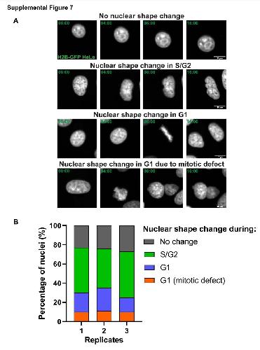 Fig. S7. Time-lapse imaging of H2B-GFP tagged HeLa cells. G1-synchronized H2BGFP HeLa cells were seeded on glass-bottom dishes, co-transfected with siRNA against Lamin A and the actinWT-NLS expression plasmid, and imaged live by confocal microscopy. Cell cycle stages were estimated based on time elapsed after mitosis (Hahn et al.,2009) . Nuclei were scored as undergoing a shape change if there was any deviation from the typical ovoid shape of HeLa cell nuclei, including nuclear elongation and lobulation. Cells were scored as having mitotic defects if metaphase plate formation was abnormal (e.g. Y-shaped metaphase plate), if mitosis was delayed (i.e. cells were arrested in metaphase for longer than 4 hours), and/or if obvious chromosome segregation defects were observed (e.g. lagging chromosomes, micronuclei, daughter nuclei that did not separate or were unequal in size). (A) Images from representative time-lapses are shown. Relative times are displayed as hours: minutes, starting at 00:00 in each case. Cropping at each time point was adjusted to account for cell migration. Nuclear shape change in S/G2 refers to nuclei that were round immediately after mitosis and subsequently underwent shape changes later in interphase. Nuclear shape change in G1 refers to nuclei that exhibited aberrant shapes immediately after mitosis in the absence of any obvious mitotic defects. (B) Based on 3 independent experiments, nuclei were categorized as shown in (A) for 300 nuclei. Mean±SD: 10.0%±0.4% for G1(mitotic defect), 19.9%±4.8% for G1, 45.4%±4.4% for S/G2, and 24.7%±1.9% for No change. |