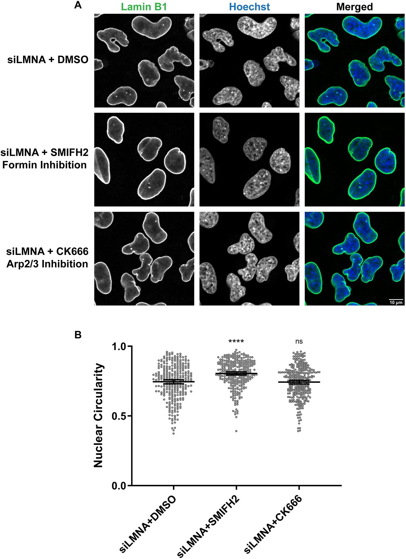 Figure 7. Formin inhibition rescues nuclear shape defects caused by Lamin A depletion in HeLa cells. Lamin A/C-knockdown HeLa cells were treated with either 25â µM SMIFH2, 100â µM CK-666 or DMSO as a control for 1â h. Fixed cells were stained for Lamin B1 (green) and DNA (Hoechst 33342, blue). (A) Representative images are shown. (B) Based on three independent experiments, nuclear circularity was quantified for 293 siLMNA+DMSO nuclei, 299 siLMNA+SMIFH2 nuclei and 305 siLMNA+CK-666 nuclei. Images were obtained by confocal microscopy. Mean values and 95% c.i. error bars are shown. Nonparametric KruskalâWallis tests were performed, showing statistical significance relative to DMSO controls. ns, not significant; ****Pâ¤0.0001. |