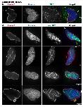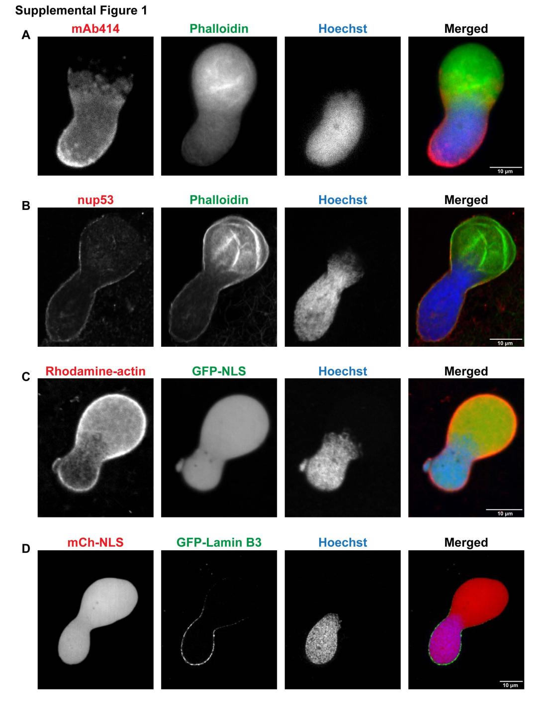 Fig. S1. Nuclear F-actin results in bilobed nuclear shape in both fixed and live nuclei in the absence of LifeAct-GFP. (A) For the experiments described in Figure 1 for F-actin intact extracts, nuclei were fixed, spun onto coverslips, and stained with mAb414 (red), Phalloidin (green), and Hoechst (blue). Representative widefield microscopy images are shown. (B) Nuclei were fixed as in (A) and stained with an antinup53 antibody (red), Phalloidin (green), and Hoechst (blue). Representative confocal microscopy images are shown. (C) Experiments were performed as in Figure 1 except that extract was supplemented with Rhodamine-actin (red), GFP-NLS (green), and Hoechst (blue). Representative live confocal microscopy images are shown. (D) Experiments were performed as in Figure 1 except that extract was supplemented with mCherry-NLS (red), GFP-Lamin B3 (green), and Hoechst (blue). Representative live confocal microscopy images are shown. |