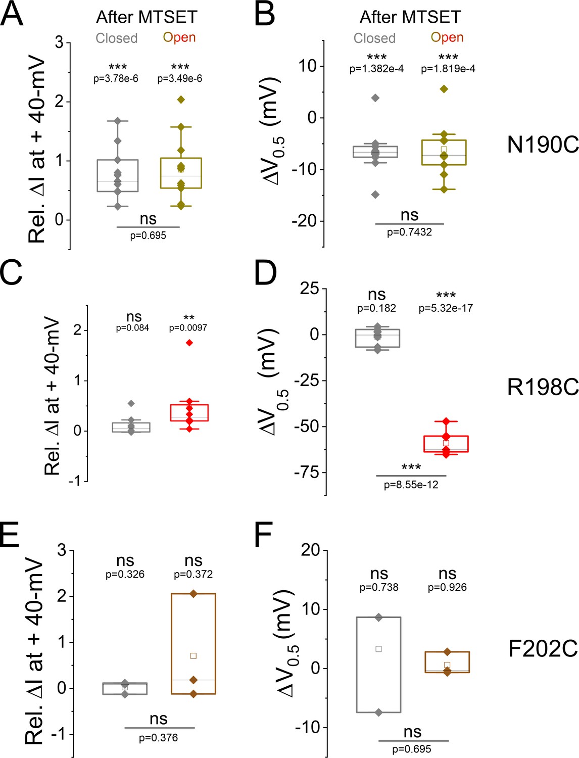 Supplementary Figure 3. Summary of modification of N190C, R198C, and F202C in the closed and open states by external methanethiosulfonate (MTSET). Summary of (A, C, and E) relative change in current amplitude at +40 mV and (B, D, and F) voltage of half activation shift of MTSET-mediated modification of the cysteine mutants in (gray) the closed and (color-coded) open states. Mean ± SEM, n=3–24. Statistical significance was determined using the paired Student’s t-test and significance level was set at p<0.05. Asterisks denote significance: p<0.01**, p<0.001***. |