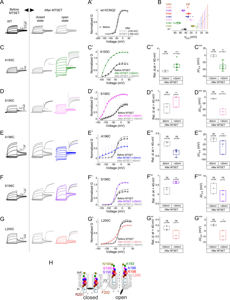 Author response image 2. (a, b’, and c’) Currents from oocytes expressing KCNQ2-N190C channels in response to 20-mV voltage steps from – 140-mV to + 40-mV (a) before and after application of MTSET in the (b’) closed and (c’) open states.(b and c) currents in response to a + 20-mV voltage step during MTSET application on N190C channels in the (b) closed and (c) open states for the indicated voltage protocols. MTSET is first applied at (b) – 80 mV for 5-s in between 25-s washouts for 8-15 cycles and the change in current is measured at + 20-mV. On the same cell and after MTSET is washed out of the bath, MTSET is re-applied at (c) + 20-mV using a similar protocol as in (b). (d) Normalized steady-state conductance/voltage relationships, G(V), (lines from a Boltzmann fit) of N190C channels normalized to peak conductance before MTSET application (black). The G(V) relationships of N190C channels before and after MTSET application in the closed (-80-mV, gray) and open (+ 20-mV, yellow) states are obtained from recordings of panels (a), (b’), and (c’), respectively. Summary of (e) relative change in current amplitude and (f) voltage dependence shift of MTSET-mediated modification of N190C channels in the (gray) closed and (yellow) open states. Mean ± SEM, n=9-24. Statistical significance was determined using the Student’s t-test and significance level was set at P < 0.05. Asterisks denote significance: p < 0.001***. |