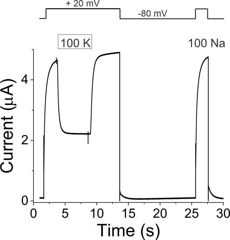 Supplementary Figure 2. Fast perfusion system delivers 5 s applications of external solution exchange to whole oocytes. Representative time course of solution exchange from 100 mM NaCl (Na) to 100 mM KCl (K). Currents from KCNQ2 channels in response to a +20 mV pulse from a holding potential of â80 mV followed by a tail potential of â80 mV. Extracellular solution was ND96 (100 mM NaCl) except for the 5 s application for which the 100 mM NaCl was exchanged for 100 mM KCl. Shown are three cycles of solution exchanging as shown in the protocol (top). The application of 100 mM KCl quickly reduces (Ï=0.21 ± 3.6 s) the outward currents, and the reintroduction of the 100 mM NaCl quickly (Ï=0.32 ± 1.5 s) restores the currents. |