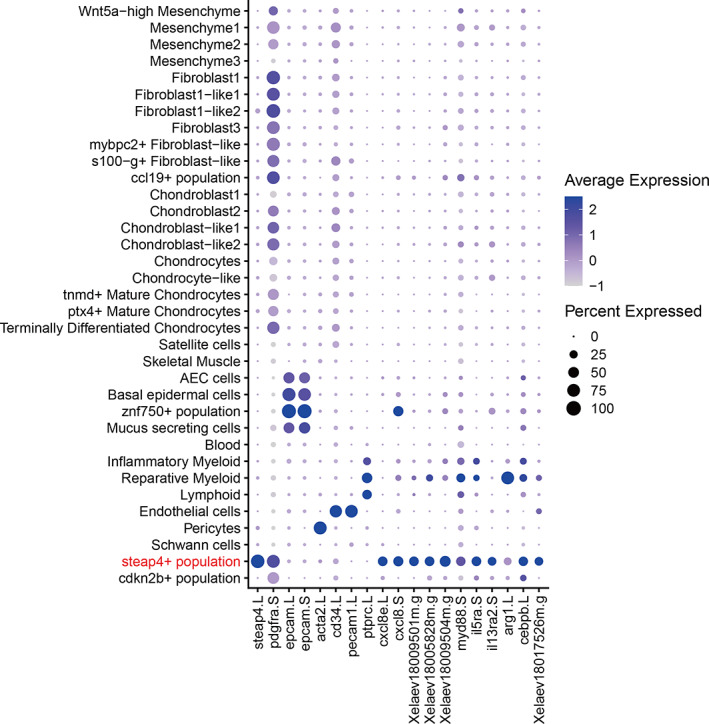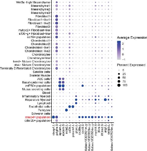 Figure 3. Characterization of the steap4+ population. Expression of several lineage marker genes across all clusters is shown. Average expression level is shown as z-score calculated using the mean expression value of the indicated cluster in both conditions (PBS and FGF10) and of all cells, indicated by dot color depth. Percentage of expressing cells in each cluster is indicated by dot size. This cluster hardly/weakly expressed epidermal (epcam.L/S), endothelial (cd34.L, pecam1.L), myofibroblast (acta2.L), and leukocyte (ptprc.L) markers, and expressed a fibroblastic gene (pdgfra.S), chemokines (cxcl8e.L, cxcl8.S, Xelaev18009501m.G [cxcl1], Xelaev18005828m.G [cxcl5], Xelaev18009504m.G [cxcl5]), and immune-related genes (myd88.S, il5ra.S, il13ra2.S, arg1.L, cebpb.L, Xelaev18017526m.G [irak3]). Mouse orthologs of each unnamed gene are shown in square brackets.