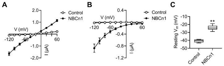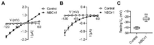 Figure 1. NBCn1 channel activity. (A) I–V relationships in oocytes expressing NBCn1 or water-injected control oocytes. Oocytes were subjected to step-voltage commands from –120 to +60 mV (20 mV steps) in CO2/HCO3−-free ND96 solution (n = 5–7/group). The increased slope of the I–V plot is a hallmark for NBCn1 channel activity. (B) INBCn1–V relationship of NBCn1 channel activity. The plot was obtained from the difference between the I–V plots in the presence and absence of bath Na+. (C) Resting membrane potentials (Vm). Vm was measured 48–72 h after cRNA injection (n = 5 controls and 16 NBCn1). ** p < 0.01, Student t-test.