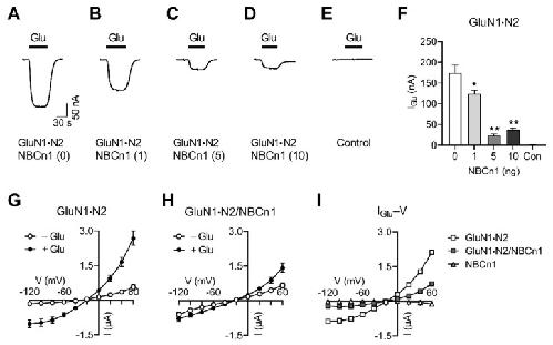 Figure 2. NBCn1 channel activity decreases IGlu produced by GluN1·N2. (A) Representative IGlu produced by GluN1·N2. IGlu was measured with an application of 100 µM glutamate (10 µM glycine, no Mg2+). Recording was performed in CO2/HCO3−-free ND96 solution containing 96 mM NaCl (holding potential of –40 mV). (B–D) Representative IGlu produced by GluN1·N2/NBCn1. A fixed amount of GluN1·N2 was coexpressed with 1, 5, or 10 ng of NBCn1. (E) Control. (F) Mean IGlu. Data were obtained from 4–5 oocytes/group. * p < 0.05, ** p < 0.01 compared to GluN1·N2 alone, one-way ANOVA with Dunnett post-test. (G) and (H) I–V relationships of glutamate-evoked responses by GluN1·N2 (n = 6; (G)) and GluN1·N2/NBCn1 (n = 5; (H)). (I) IGlu–V relationships. IGlu is the mean difference before and after glutamate application in (G) and (H). NBCn1 alone served as a control (n = 4).