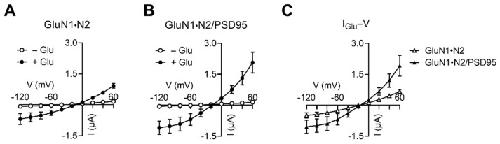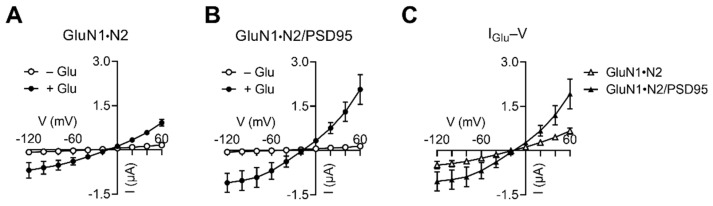 Figure 3. PSD95 increases IGlu produced by GluN1·N2. (A) I–V relationships of glutamate-evoked responses by GluN1·N2 (n = 3). (B) I–V relationships of glutamate-evoked responses by GluN1·N2/PSD95 (n = 5). (C) IGlu–V relationships. IGlu is the mean difference before and after glutamate application in (A) and (B).