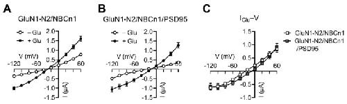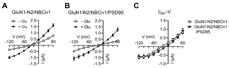 Figure 4. PSD95 has negligible effect on IGlu in the presence of NBCn1. (A) I–V relationships of glutamate-evoked responses by GluN1·N2/NBCn1 (n = 11). (B) I–V relationships of glutamate-evoked responses by GluN1·N2/PSD95/NBCn1 (n = 7). (C) IGlu–V relationships. IGlu is the mean difference before and after glutamate application in (A,B).