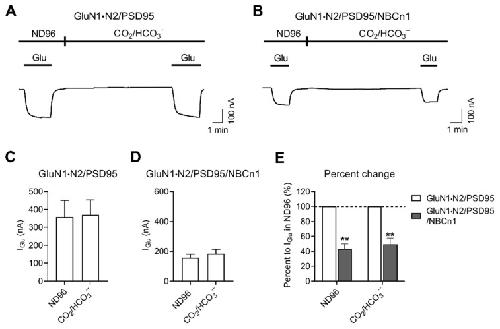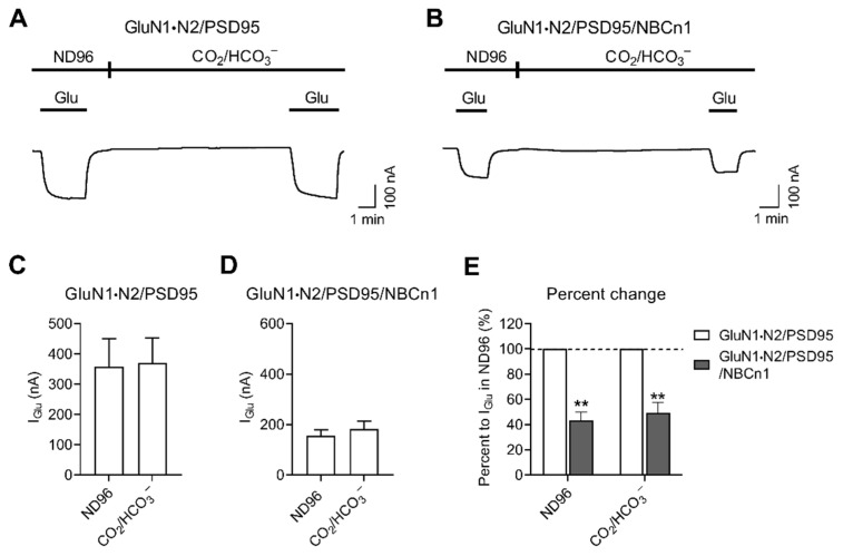 Figure 5. The IGlu decrease by NBCn1 channel activity is independent of CO2/HCO3−. (A,B) Representative IGlu produced by GluN1·N2/PSD95 (A) and GluN1·N2/PSD95/NBCn1 (B). IGlu was measured in ND96 solution and 10 min after applying a solution equilibrated with 10% CO2, 50 mM HCO3− at constant pH 7.4. Except when glutamate was applied, Na+-free CO2/HCO3− solution was applied to minimize pHi change by cotransport activity. (C) Mean IGlu produced by GluN1·N2/PSD95 (n = 4; (C)) and GluN1·N2/PSD95/NBCn1 (n = 6; (D)). (E) Effects of NBCn1 on IGlu in the absence and presence of CO2/HCO3−. Data were presented as percent change relative to IGlu by GluN1·N2/PSD95. ** p < 0.01.