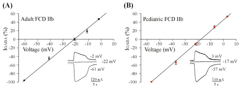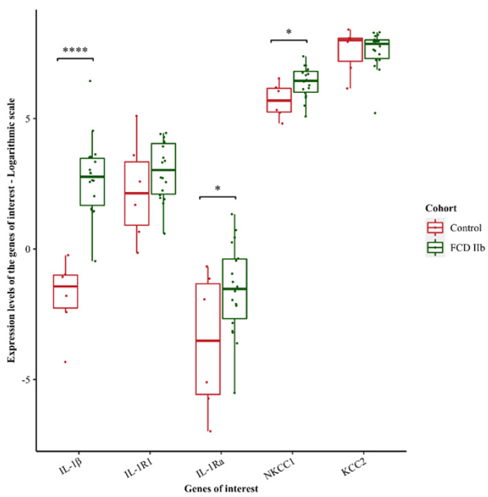 Focal cortical dysplasia (FCD) type II is an epileptogenic malformation of the neocortex, as well as a leading cause of drug-resistant focal epilepsy in children and young adults. The synaptic dysfunctions leading to intractable seizures in this disease appear to have a tight relationship with the immaturity of GABAergic neurotransmission. The likely outcome would include hyperpolarizing responses upon activation of GABAARs. In addition, it is well-established that neuroinflammation plays a relevant role in the pathogenesis of FCD type II. Here, we investigated whether IL-1β, a prototypical pro-inflammatory cytokine, can influence GABAergic neurotransmission in FCD brain tissues. To this purpose, we carried out electrophysiological recordings on Xenopus oocytes transplanted with human tissues and performed a transcriptomics analysis. We found that IL-1β decreases the GABA currents amplitude in tissue samples from adult individuals, while it potentiates GABA responses in samples from pediatric cases. Interestingly, these cases of pediatric FCD were characterized by a more depolarized EGABA and an altered transcriptomics profile, that revealed an up-regulation of chloride cotransporter NKCC1 and IL-1β. Altogether, these results suggest that the neuroinflammatory processes and altered chloride homeostasis can contribute together to increase the brain excitability underlying the occurrence of seizures in these children.