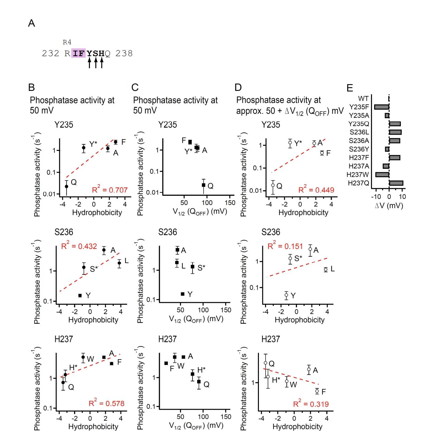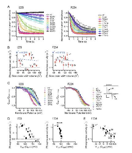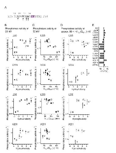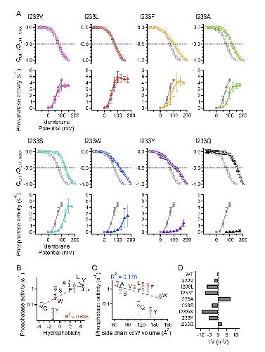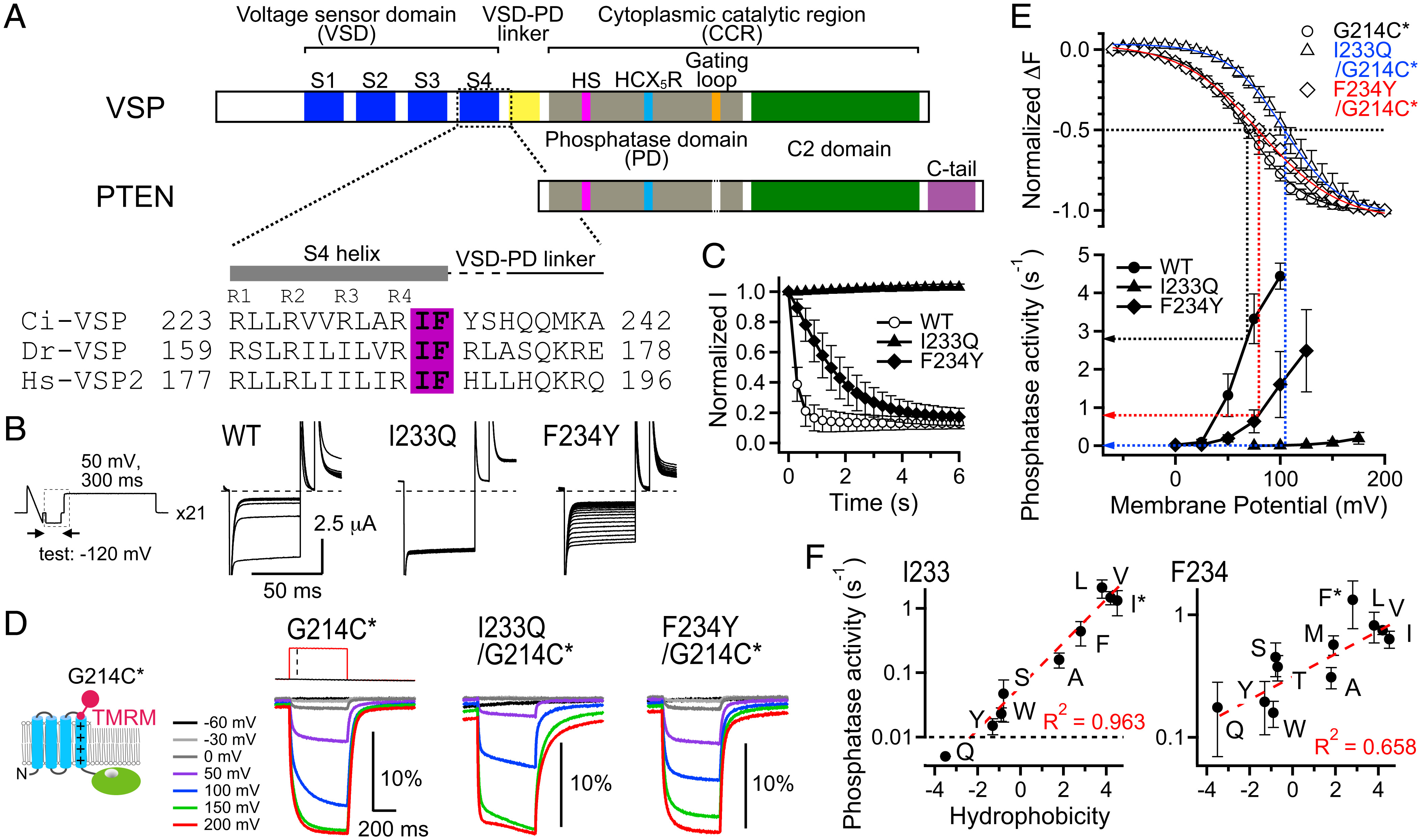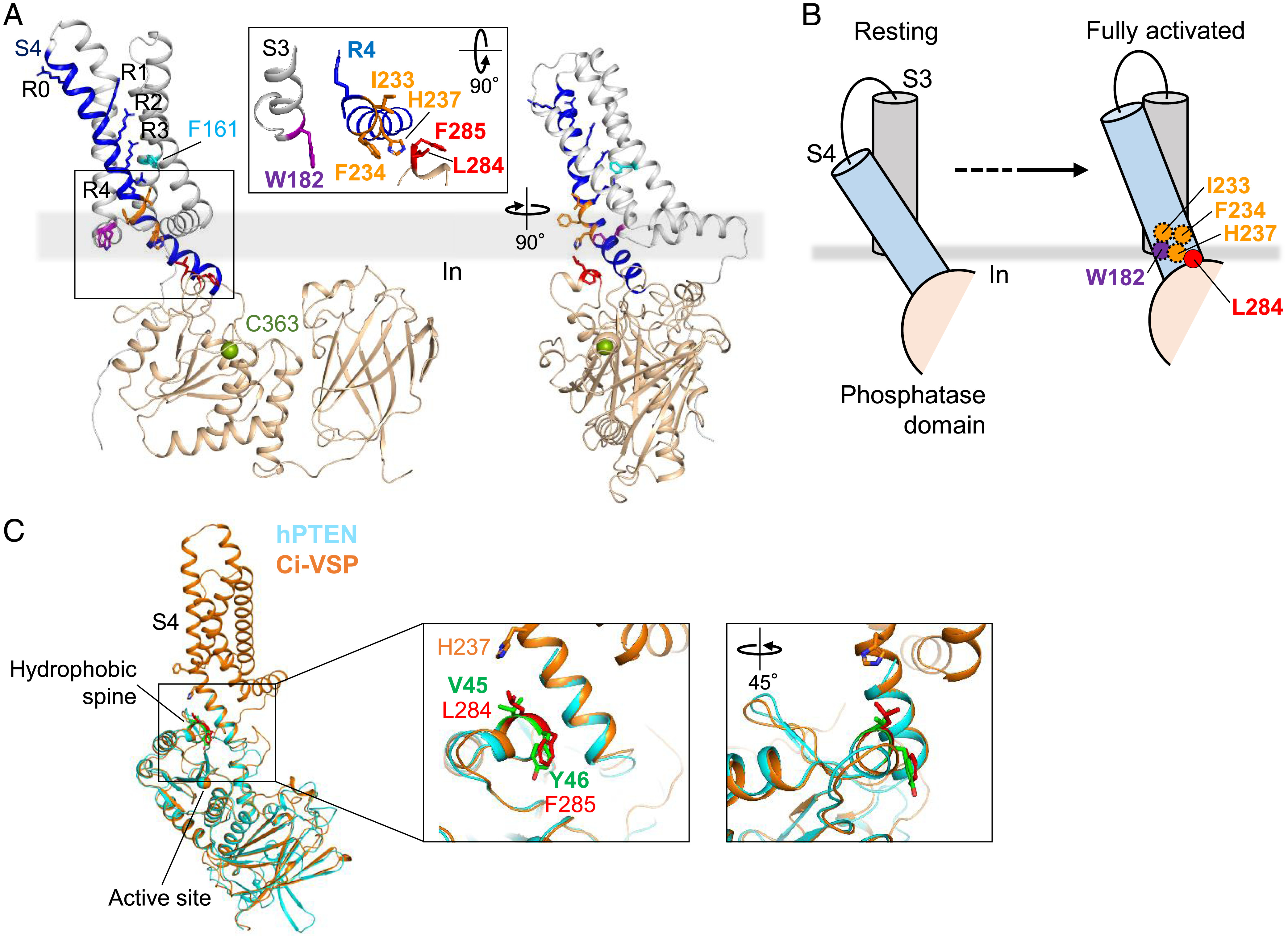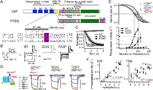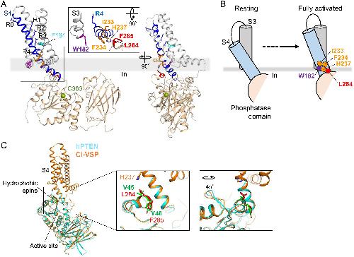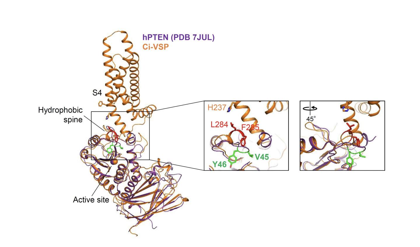 Interaction between S4 and the phosphatase domain mediates electrochemical coupling in voltage-sensing phosphatase (VSP).