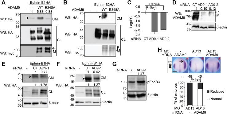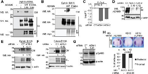 Figure 1. ADAM9 cleaves ephrin-B1 and -B2 and can substitute for Xenopus ADAM13 in neural crest induction. A and B, HEK293T cells were transfected with plasmids encoding N-terminally HA-tagged ephrin-B1 (A) or -B2 (B) and C-terminally myc-tagged WT ADAM9 or the E348A mutant, and Western blotting was carried out using the indicated antibodies. Arrowheads point to the shed ectodomain of ephrin-Bs. C and D, HCT116 cells were transfected with the indicated siRNA, and RT-qPCR (C) and Western blotting (D) were carried out for ADAM9 mRNA and protein, respectively. Unpaired t tests were performed for log2FC of mRNA levels obtained for three biological replicates in (C), and error bars represent SEM. E-G, HCT116 (E and G) or SW620 (F) cells were transfected with the indicated siRNA and plasmid, and Western blotting was carried out using an anti-HA (E and F) or phospho-EphB3 (G) antibody. H, two-cell stage Xenopus tropicalis embryos were injected in one blastomere with the indicated MO and mRNA, allowed to develop to stage â¼12.5, and processed for in situ hybridization for snai2. Ï2 test was performed for the percentage of normal embryos (n indicates total number of embryos examined). Red asterisks denote the injected side, and arrow indicates the expansion of snai2 expression domain. The scale bar represents 250 μm. CL, cell lysates; CM, conditioned media; CT, control; FC, fold change; M, mature form; P, pro-form (same below). ADAM, A Disintegrin and Metalloprotease; RT-qPCR, quantitative RT-PCR; MO, morpholino. |