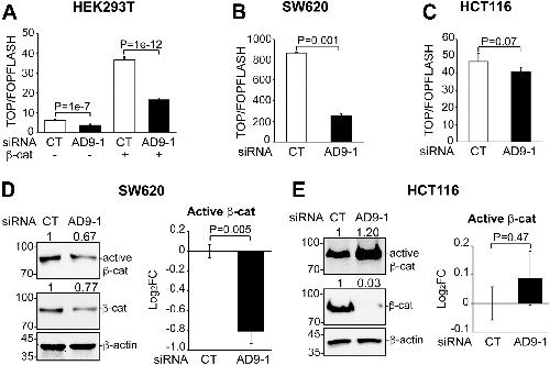 Figure 3. KD of ADAM9 inhibits Wnt activity in HEK293T and SW620 but not HCT116 cells. Cells were transfected with the indicated siRNA and plasmid. A-C, TOP/FOPFLASH luciferase reporter assays were carried out in triplicate with the indicated cell lines, and unpaired t tests were performed to compare Wnt activity. Error bars represent SD. D and E, Western blotting was carried out for cell lysates with the antibodies for total and active β-catenin, as indicated, in SW620 (D) or HCT116 (E) cells. Western blotting was repeated in triplicate to confirm the effects of ADAM9 KD on active β-catenin (see Fig. S3 for images of blots); unpaired t tests were performed for log2FC of protein levels and summarized in graphs (error bars represent SEM). ADAM, A Disintegrin and Metalloprotease; KD, knockdown. |