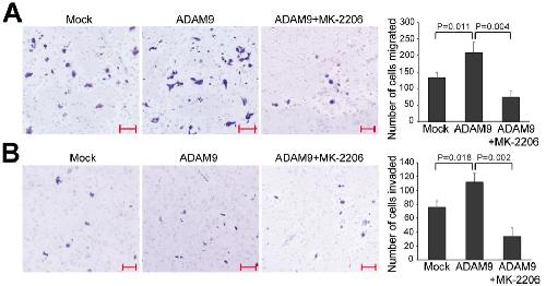 Figure S6 Overexpression of ADAM9 in HCT116 cells leads to increased migration and invasion, which can be blocked by Akt inhibition. HCT116 cells were transfected with empty pCS2+ vector (Mock) or pCS2+:Adam9, and treated with DMSO (vehicle control) or 12.5 nM of the selective Akt inhibitor MK-2206. Transwell migration (A) and invasion (B) assays were carried out. Results of 3 biological replicates for each treatment are summarized on the right, and unpaired t test was performed. Error bars represent standard deviation. Scale bars, 100 μm. |
