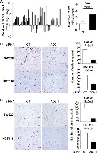 Figure 2. ADAM9 mRNA is upregulated in human CRC samples and promotes CRC cell migration and invasion in vitro. A, comparison of ADAM9 transcripts in CRC tissues (T) with matched adjacent normal tissues (N) from individual patients, as measured by RT-qPCR analyses (left). Results of 48 samples are summarized on the right, and Wilcoxon matched-pairs signed rank test was performed. B and C, SW620 or HCT116 cells were transfected with the indicated siRNA, and transwell migration (B) and invasion (C) assays were carried out as described in Experimental procedures. Results of three biological replicates for each treatment are summarized on the right, and unpaired t test was performed. Error bars represent SD. The scale bars represent 100 μm. ADAM, A Disintegrin and Metalloprotease; CRC, colorectal cancer; RT-qPCR, quantitative RT-PCR. |