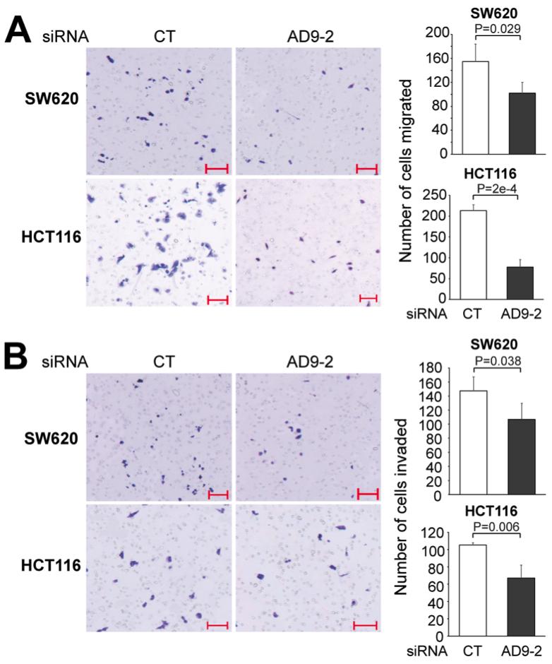 Figure S2 Transfection of SW620 and HCT116 cells with siAD9-2 inhibits migration and invasion. SW620 or HCT116 cells were transfected with the indicated siRNA, and transwell migration (A) and invasion (B) assays were carried out as described in Experimental procedures. Results of 3 biological replicates for each treatment are summarized on the right, and unpaired t test was performed. Error bars represent standard deviation. Scale bars, 100 μm. |