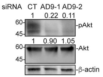 Figure S5 Transfection of HCT116 cells with either siAD9-1 or siAD9-2 inhibits Akt activity. HCT116 cells were transfected with the indicated siRNA, and western blotting was carried out for cell lysates using the indicated antibodies. |