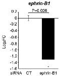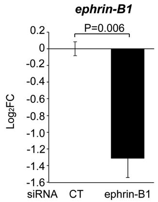 Figure S7 The ephrin-B1 siRNAs effectively reduce ephrin-B1 mRNA in SW620 cells. SW620 cells were transfected with the indicated siRNAs, and RT-qPCR was carried out for ephrin-B1 mRNA. Unpaired t tests were performed for log2FC of mRNA levels obtained for 3 biological replicates, and error bars represent standard error of the mean (SEM). |