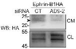 Figure S1 Transfection of HCT116 cells with siAD9-2 inhibits ephrin-B1 shedding. HCT116 cells were transfected with a plasmid encoding N-terminally HA-tagged ephrin-B1 with siControl (CT) or siAD9-2, and western blotting was carried out for conditioned media (CM) or cell lysates (CL) using an anti-HA antibody. |