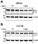 Figure S3 KD of ADAM9 reduces active b-catenin in SW620 but not HCT116 cells. SW620 (A) and HCT116 (B) cells were transfected with the indicated siRNA, and western blotting was performed for cell lysates using the indicated antibodies. Experiments were carried out in triplicate, and statistics are presented in Fig. 3D and E, respectively. |